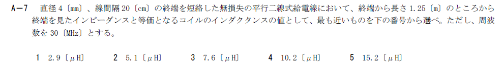 平行二線式給電線のインピーダンスと等化なコイルのインダクタンスを計算する問題です。