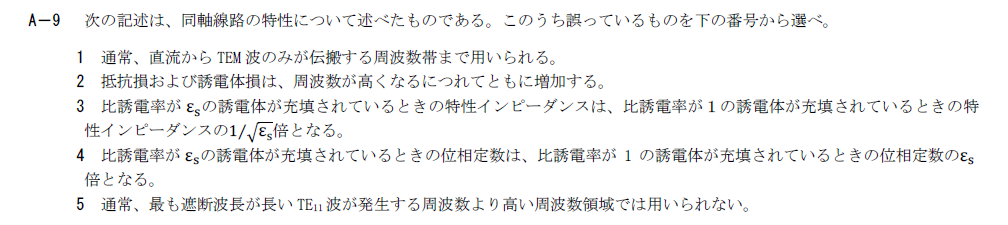 同軸線路の特性に関して、誤った選択肢を選ぶ問題です。