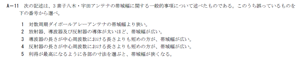 八木・宇田アンテナ(通称:八木アンテナ)について誤った選択肢を選ぶ問題です。
