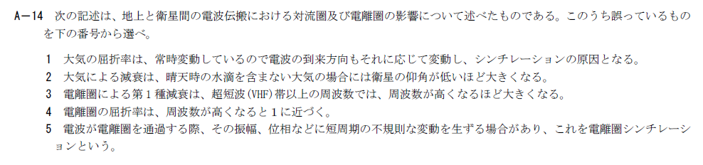 地上と衛星間の電波伝搬に関して、誤った選択肢を選ぶ問題です。