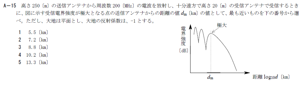 \[ \frac{2\pi h_th_r}{\lambda d}=\frac{\pi}{2} \\ d=\frac{4h_th_r}{\lambda}=\frac{4\times 250 \times 20}{1.5}\rm{[m]}=13.3\rm{[km]} \] で答えは5です。