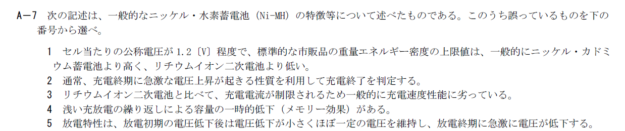 ニッケル・水素蓄電池に関して誤った選択肢を選ぶ問題です。