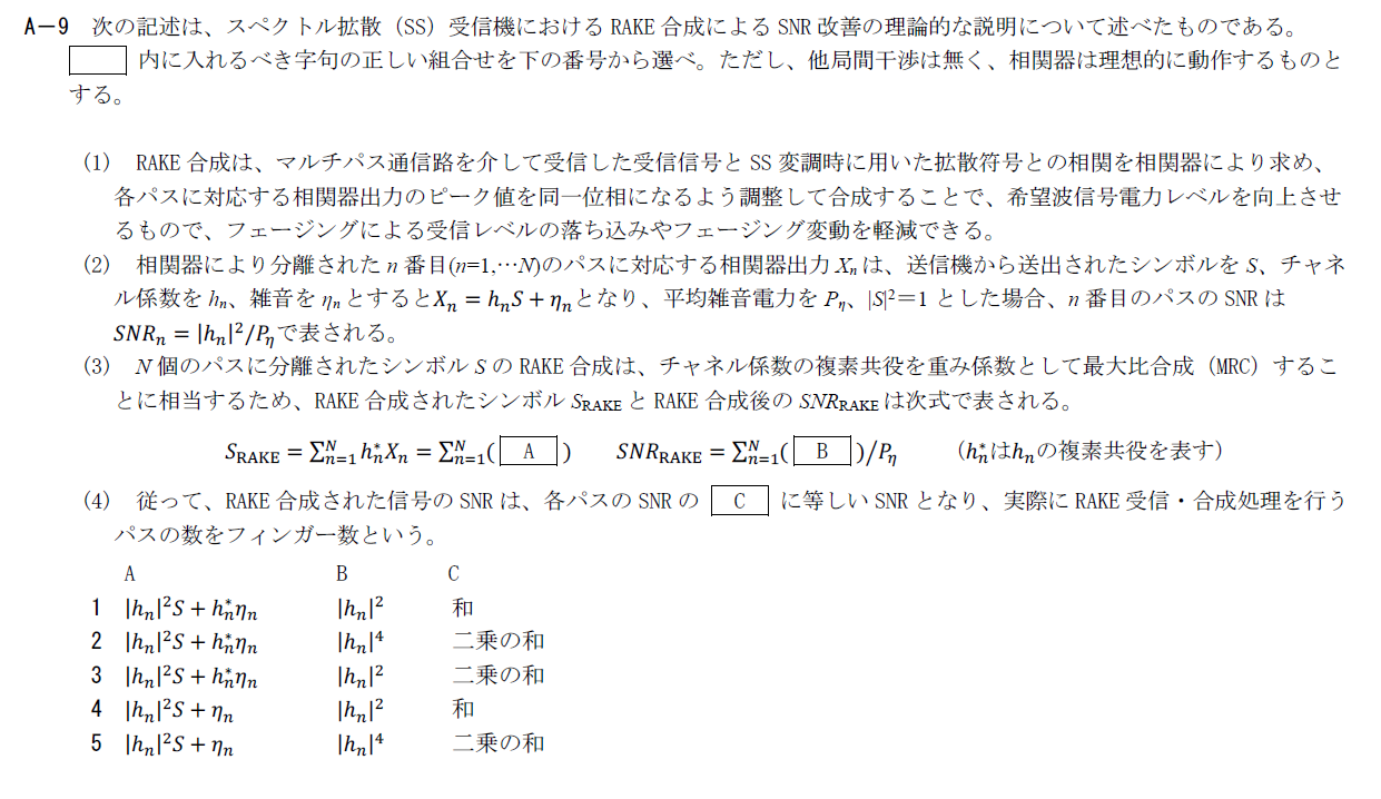 スペクトル拡散で使用されるRAKE合成に関する問題です。