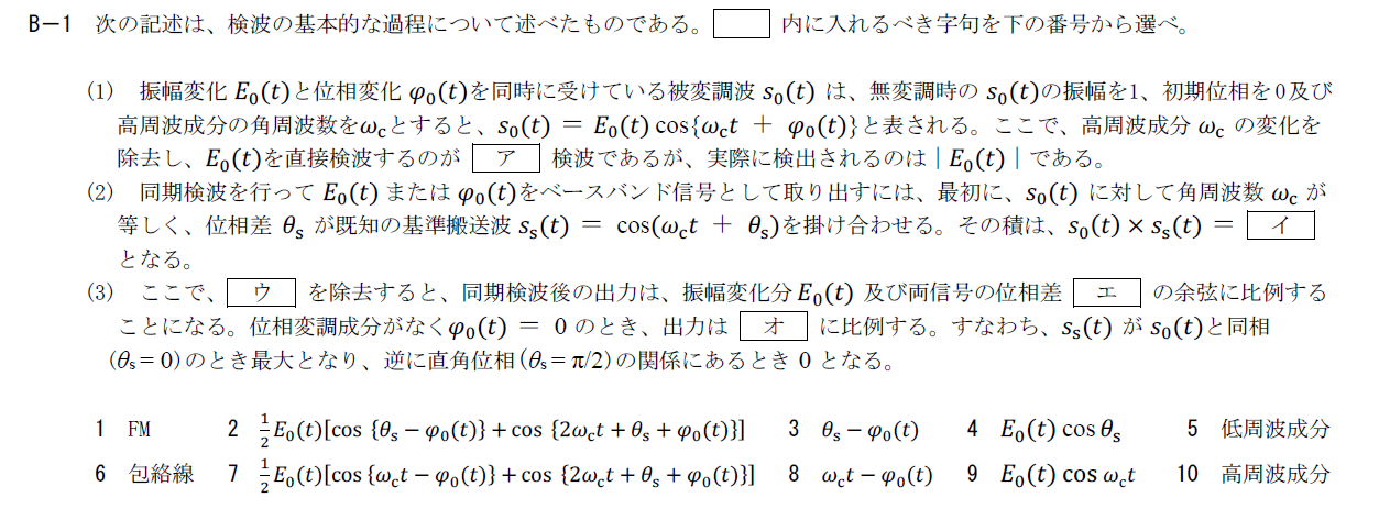 - イ:2.$\frac{1}{2}E_0(t)\left[\cos\left\{\theta_s-\phi_0(t)\right\}+\cos\left\{2\omega_ct +\theta_s \phi_0(t)\right\}\right]$