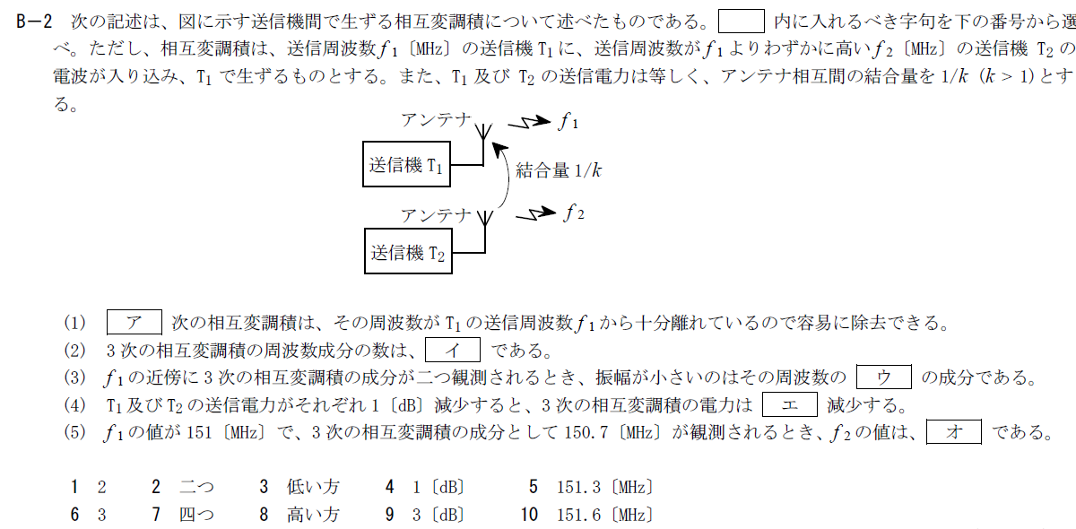 相互変調積の問題はいろいろな形式で出題されているのでいくつか過去の記事も紹介しておきます。こちらも適宜参考にしてください。